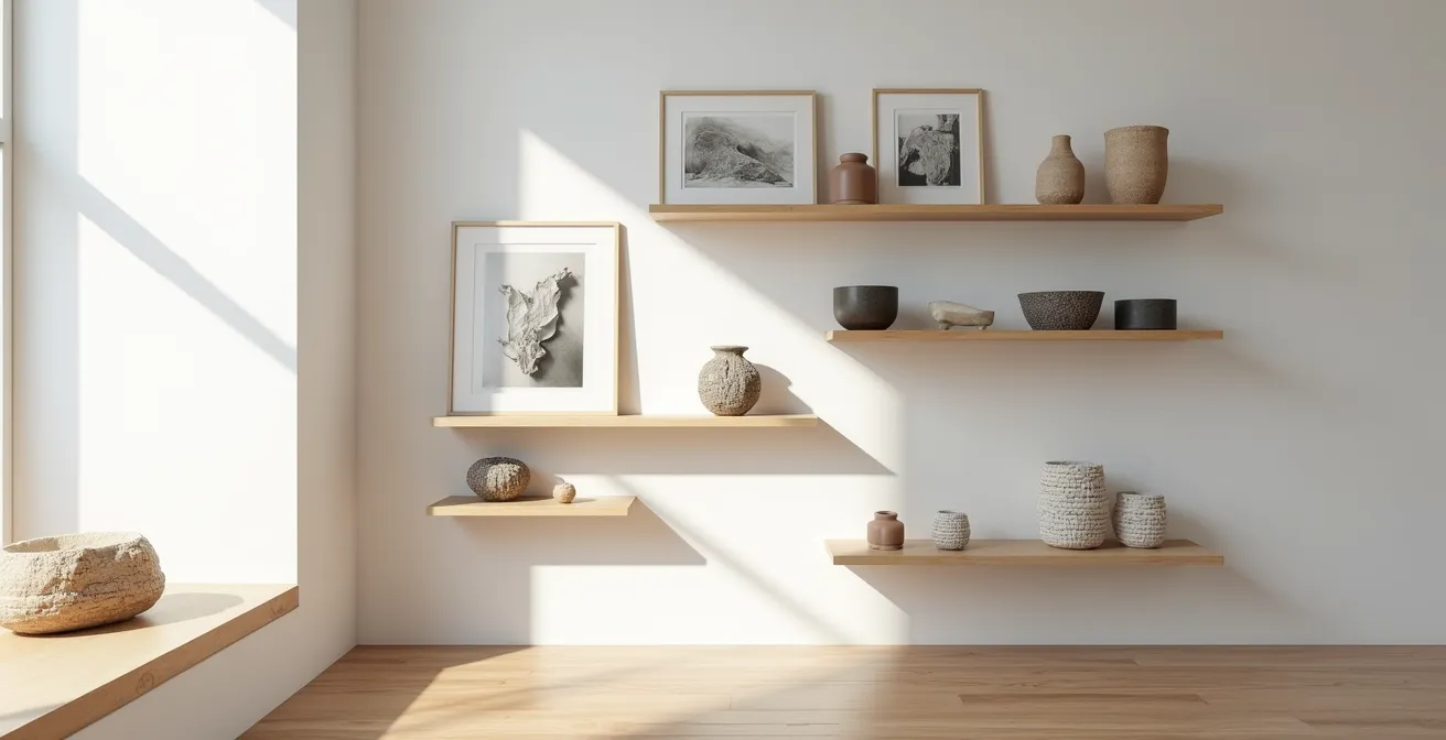 La première règle est de jouer sur les contrastes de matières, de formes et de hauteurs. Associez une céramique brute à un objet en métal poli, une petite photographie encadrée à une sculpture organique. Utilisez des socles ou des piles de livres pour créer différents niveaux et donner à chaque pièce l’espace nécessaire pour respirer. L’étagère, qu’elle soit un système modulaire comme un USM Haller ou une simple planche de bois brut, devient une scène où vos trésors interagissent. N’ayez pas peur du vide : l’espace négatif est aussi important que les objets eux-mêmes, car il guide le regard et met en valeur chaque élément.
